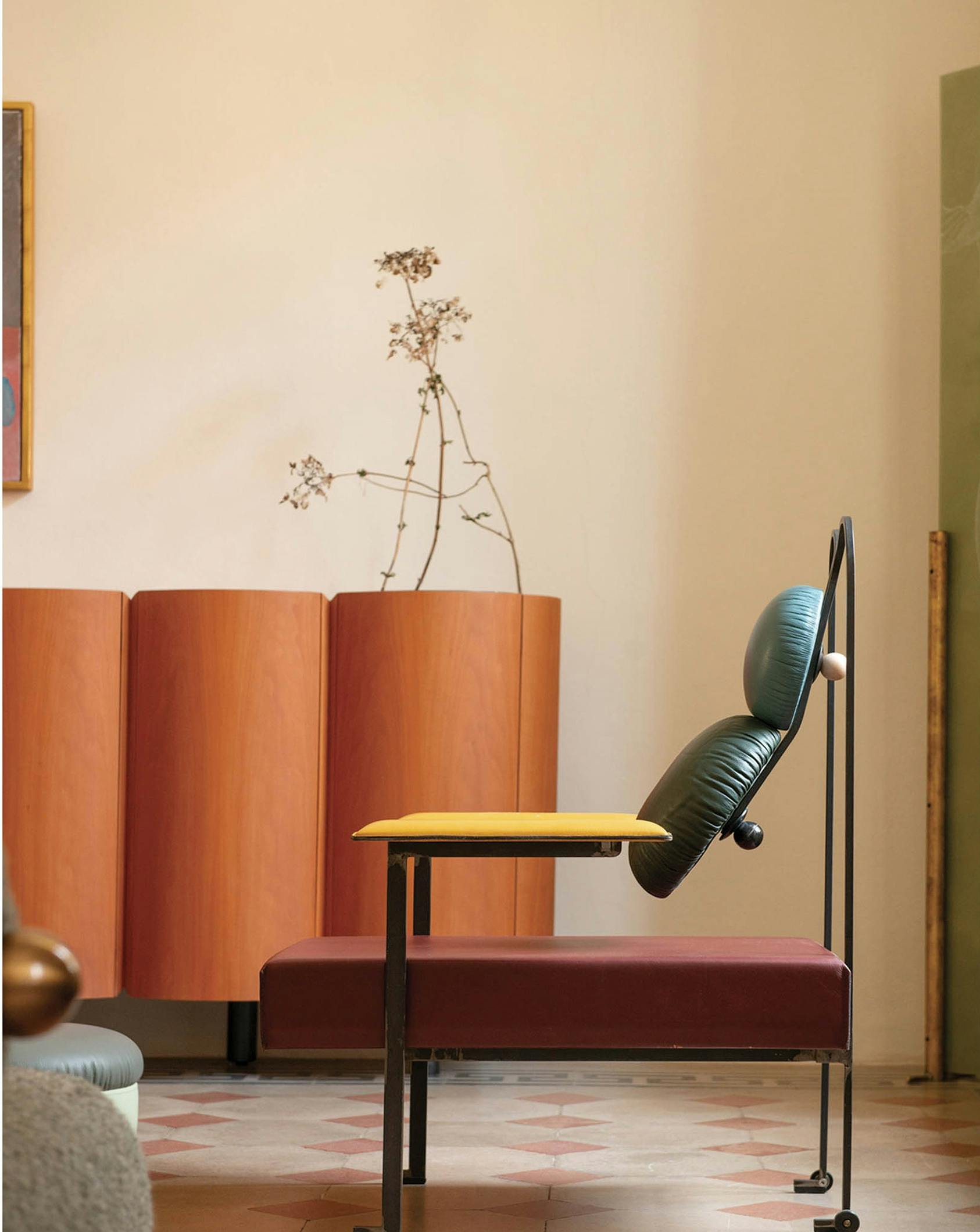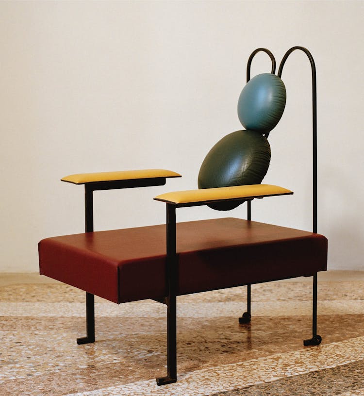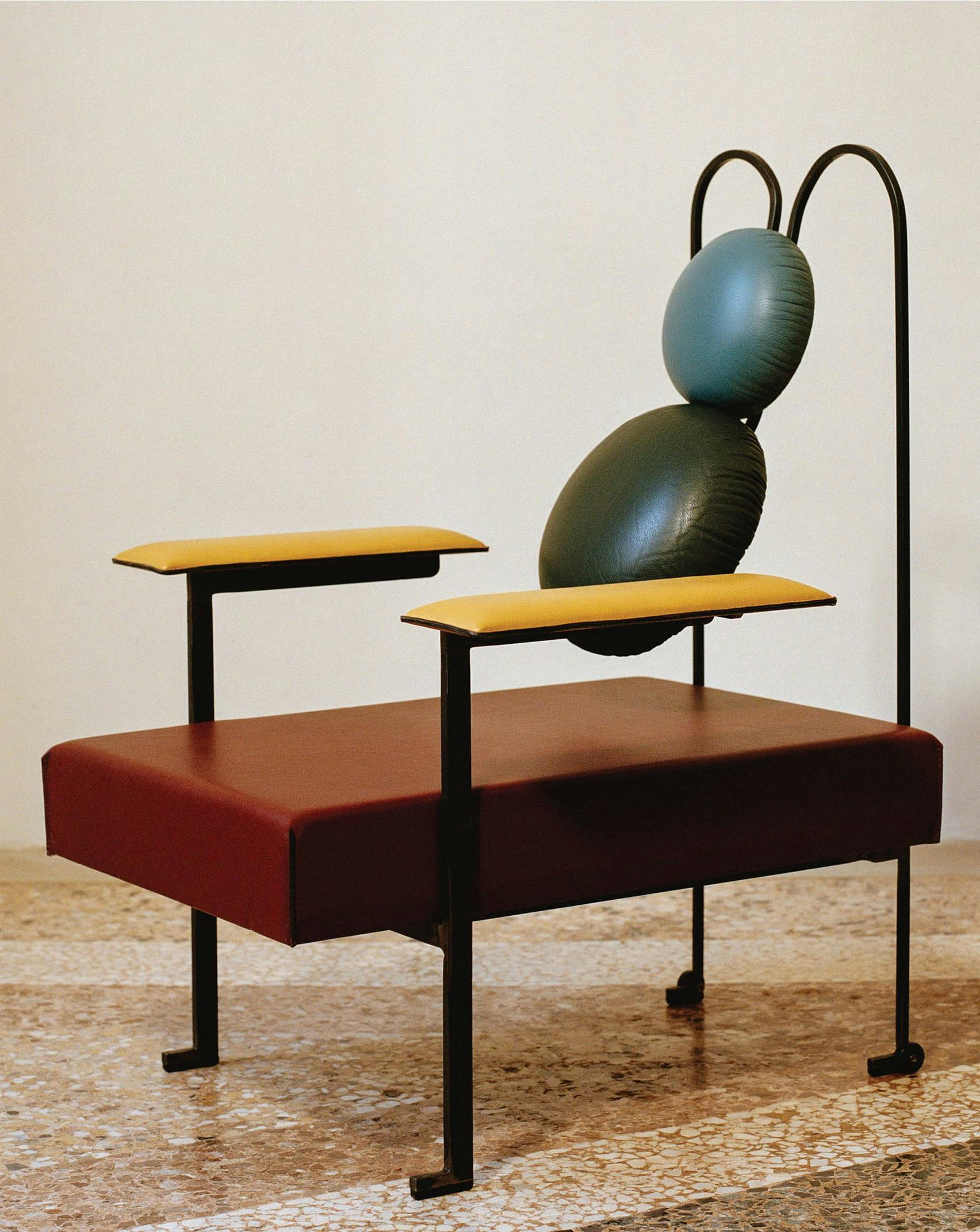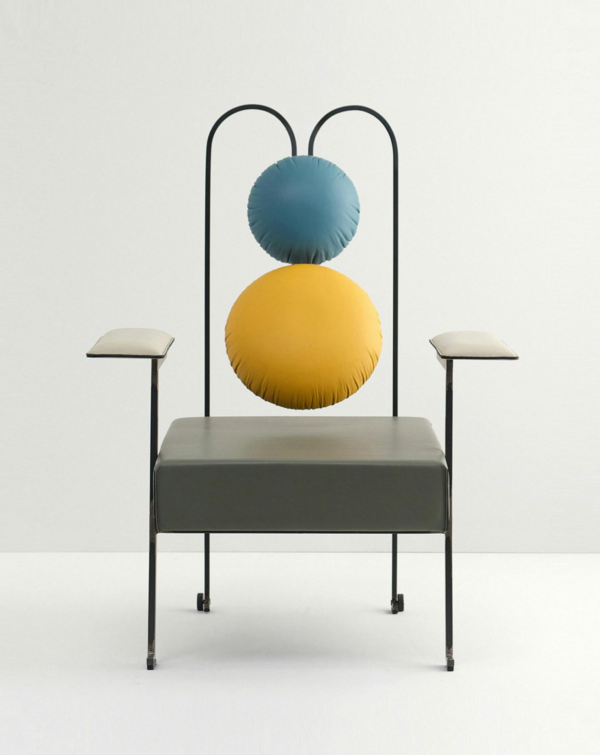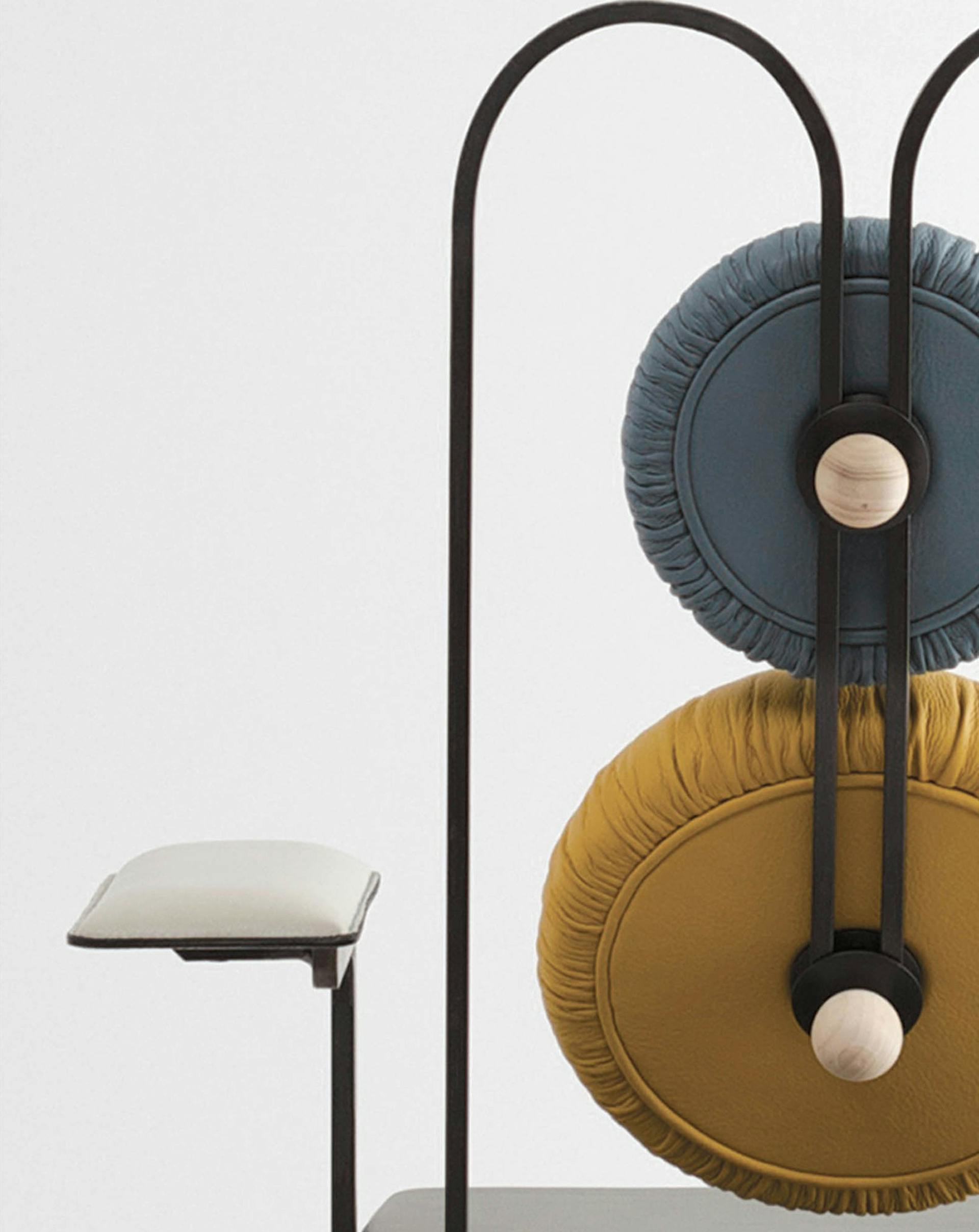 Stripping down the armchair to its most essential elements. The three way bent rear metal structure creates a spring" that allows the backrest to give both lumbar and upper back support, moving with the back of the user. The top circle cushion can be adjusted in height to give either support to the head and neck or the upper back.