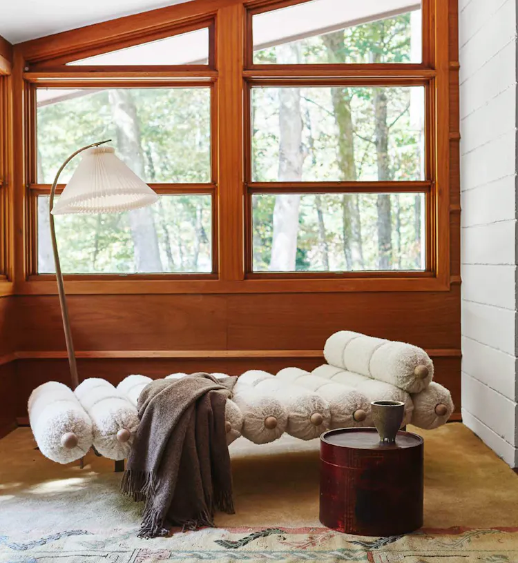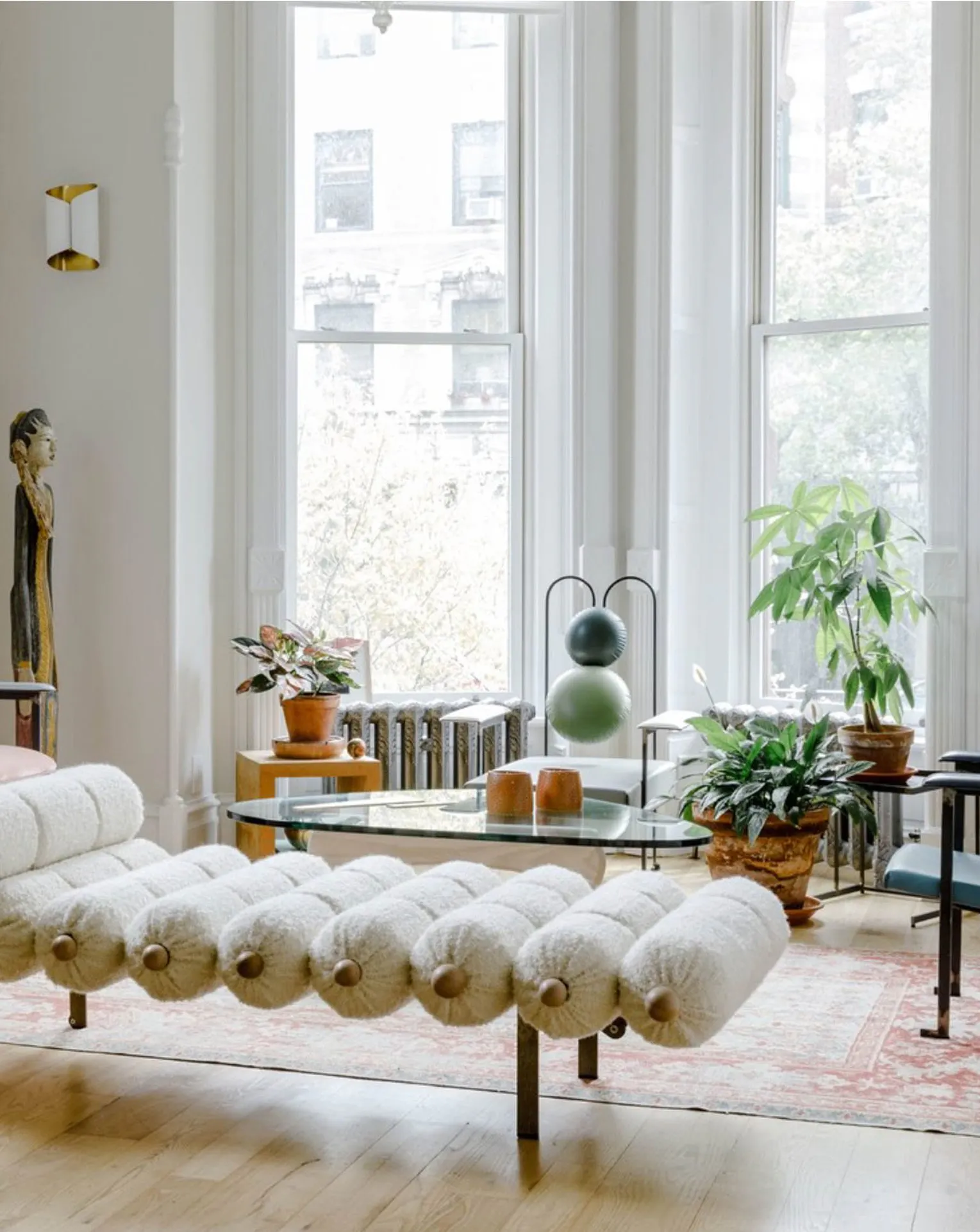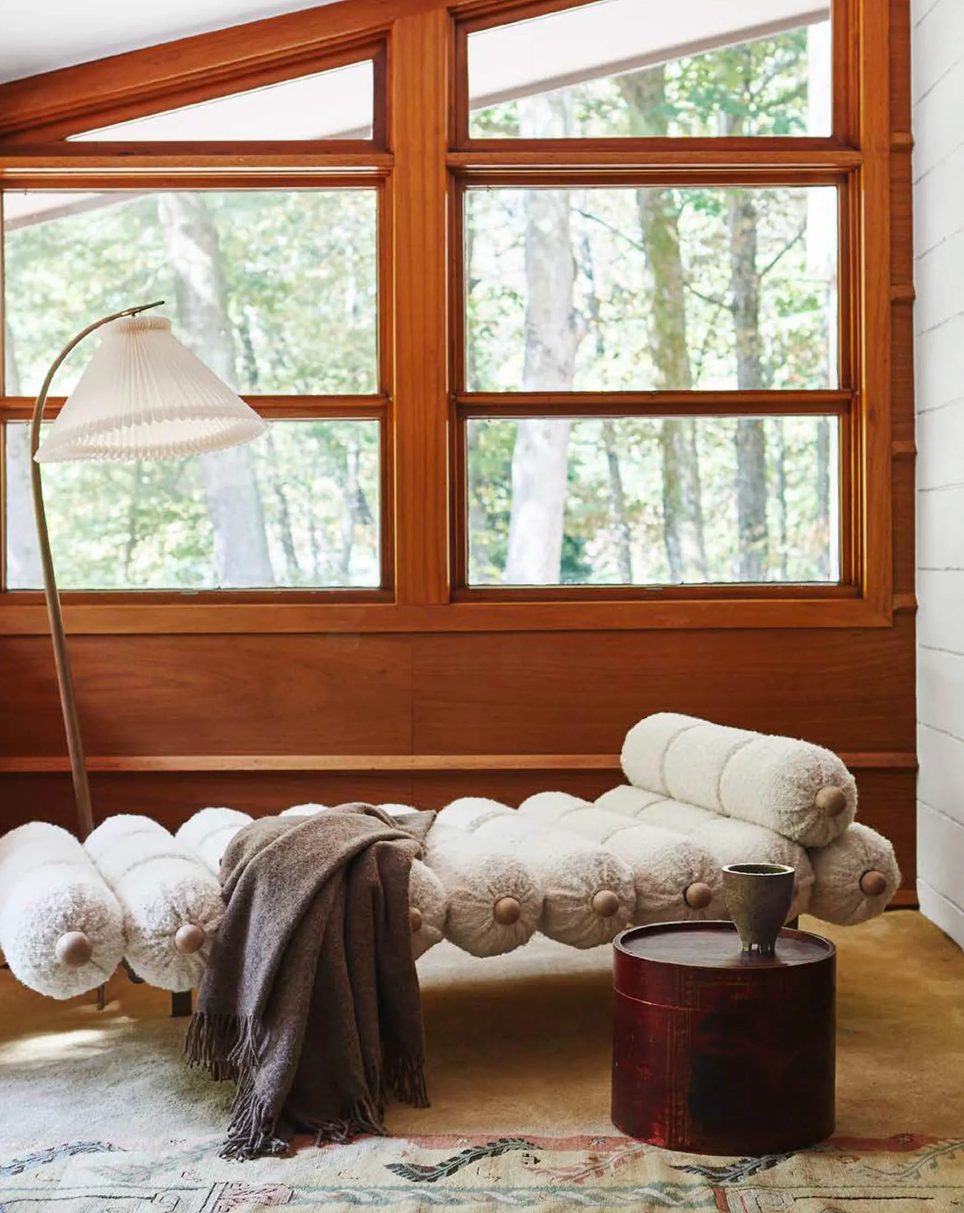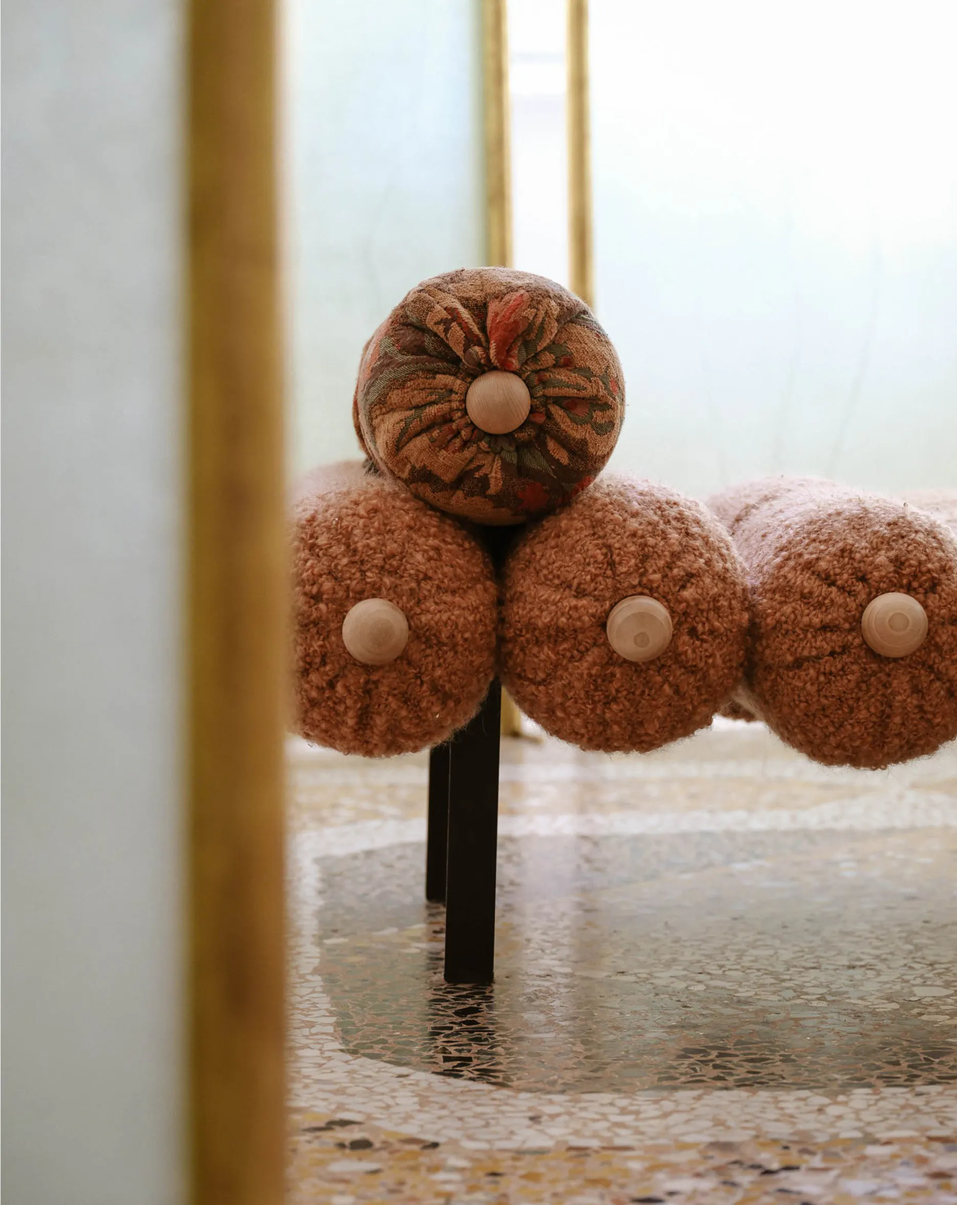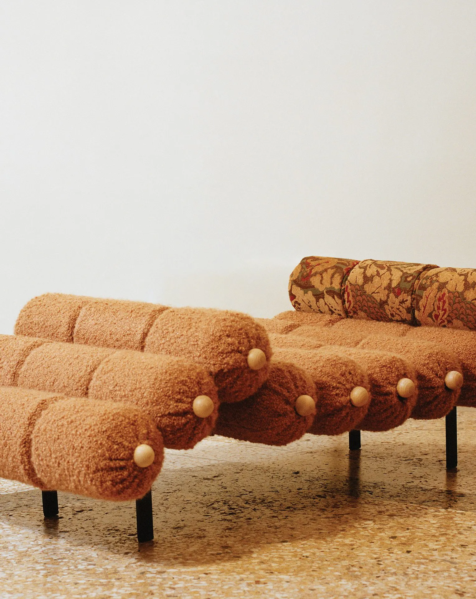 Inspired by the traditional Indian cushions from which the piece takes its name, Masand is a padded bench that can be reconfigured as a chaise longue.