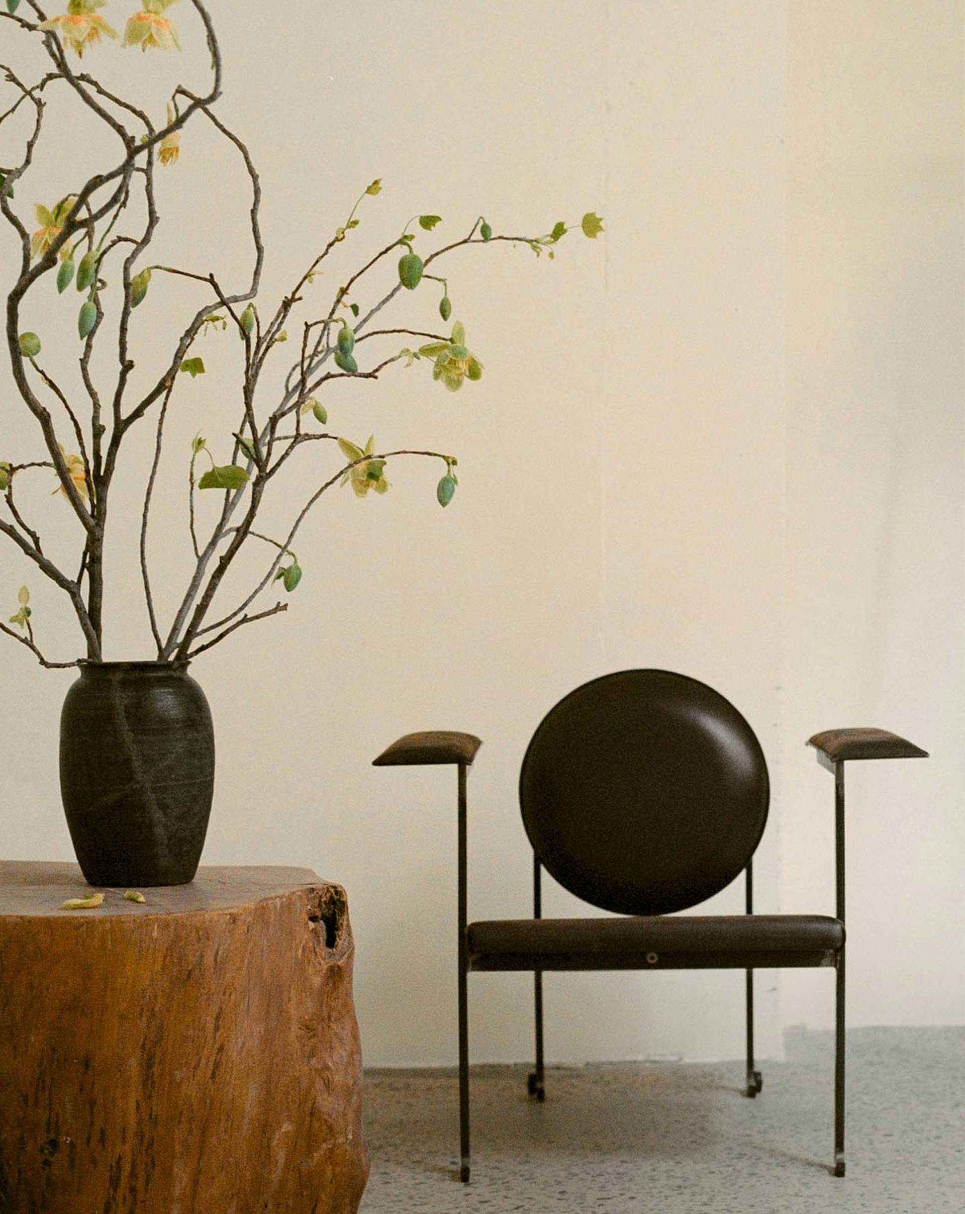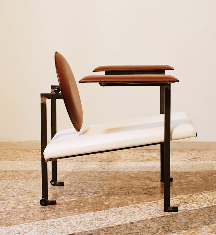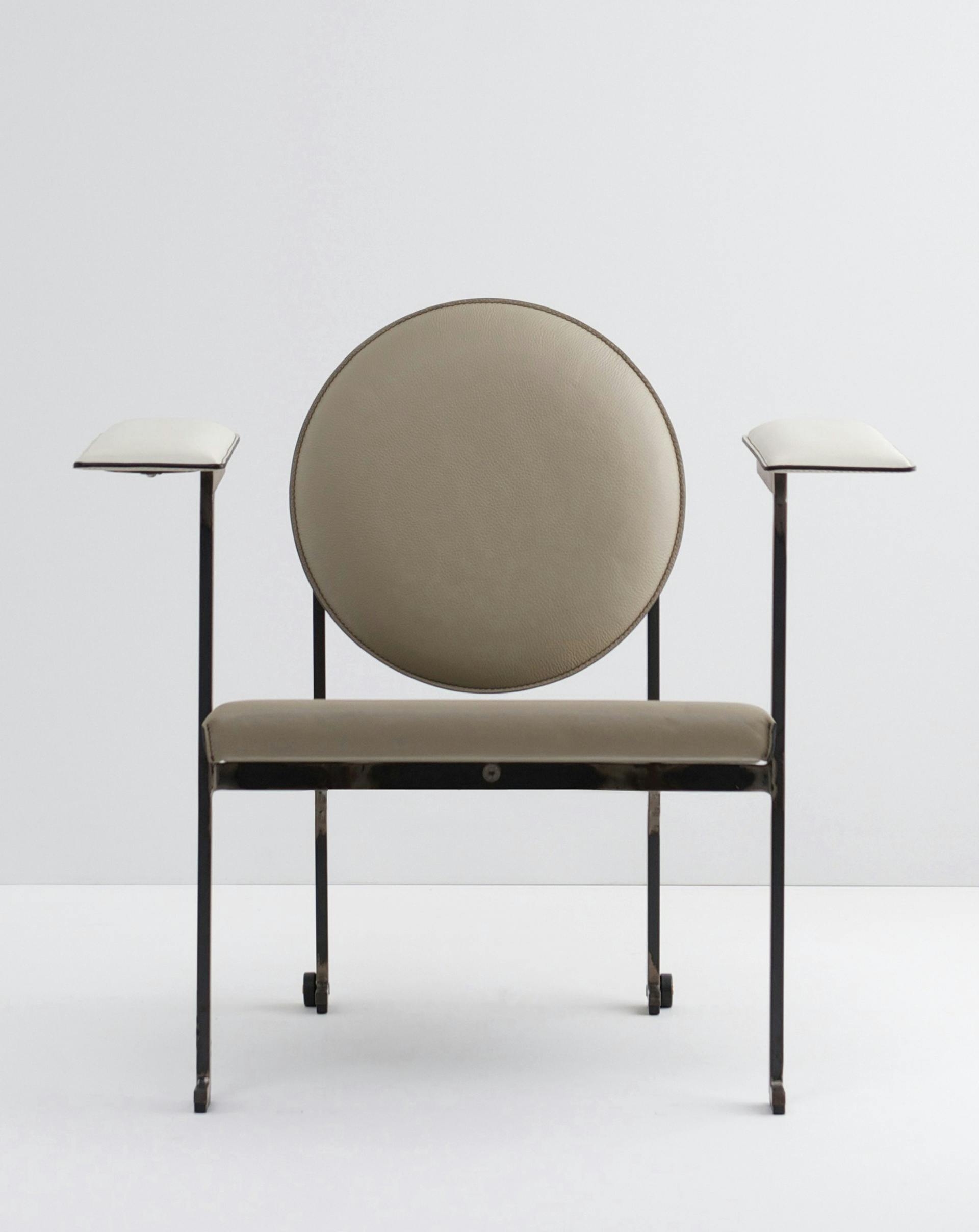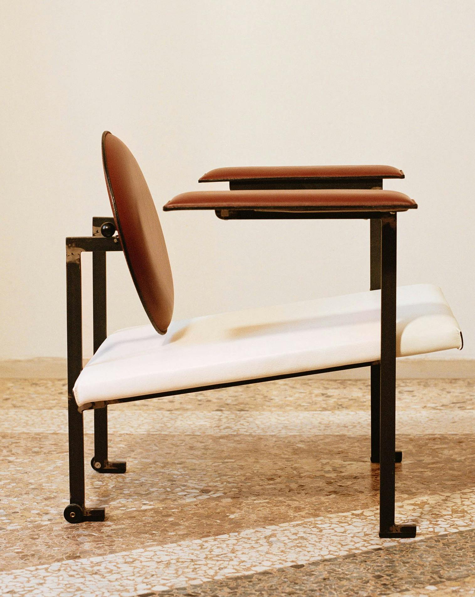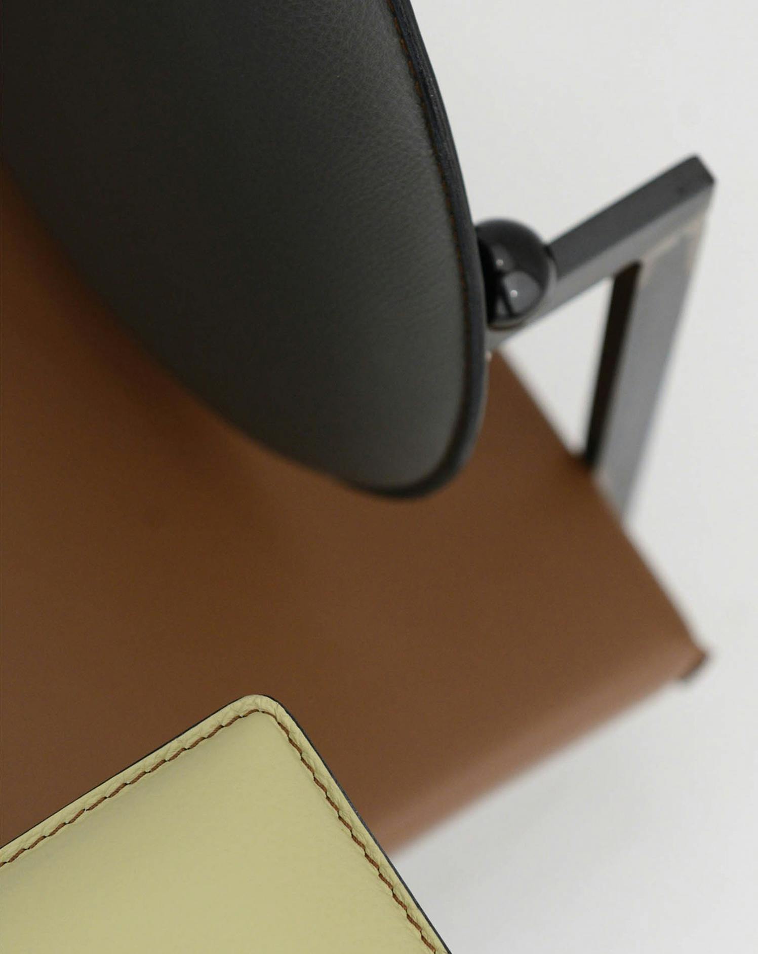 Armchair based on the tilting backrest introduced by Le Corbusier -the name mm1 is in celebration of the master. The two adjustable spheres on the back regulate the tilting angle of the backrest.