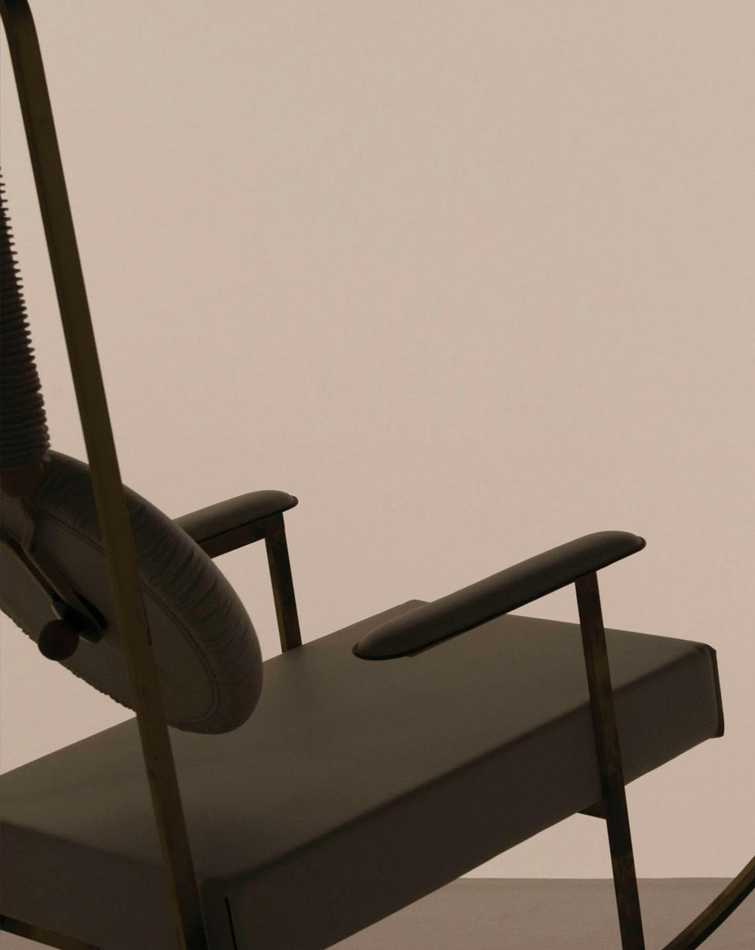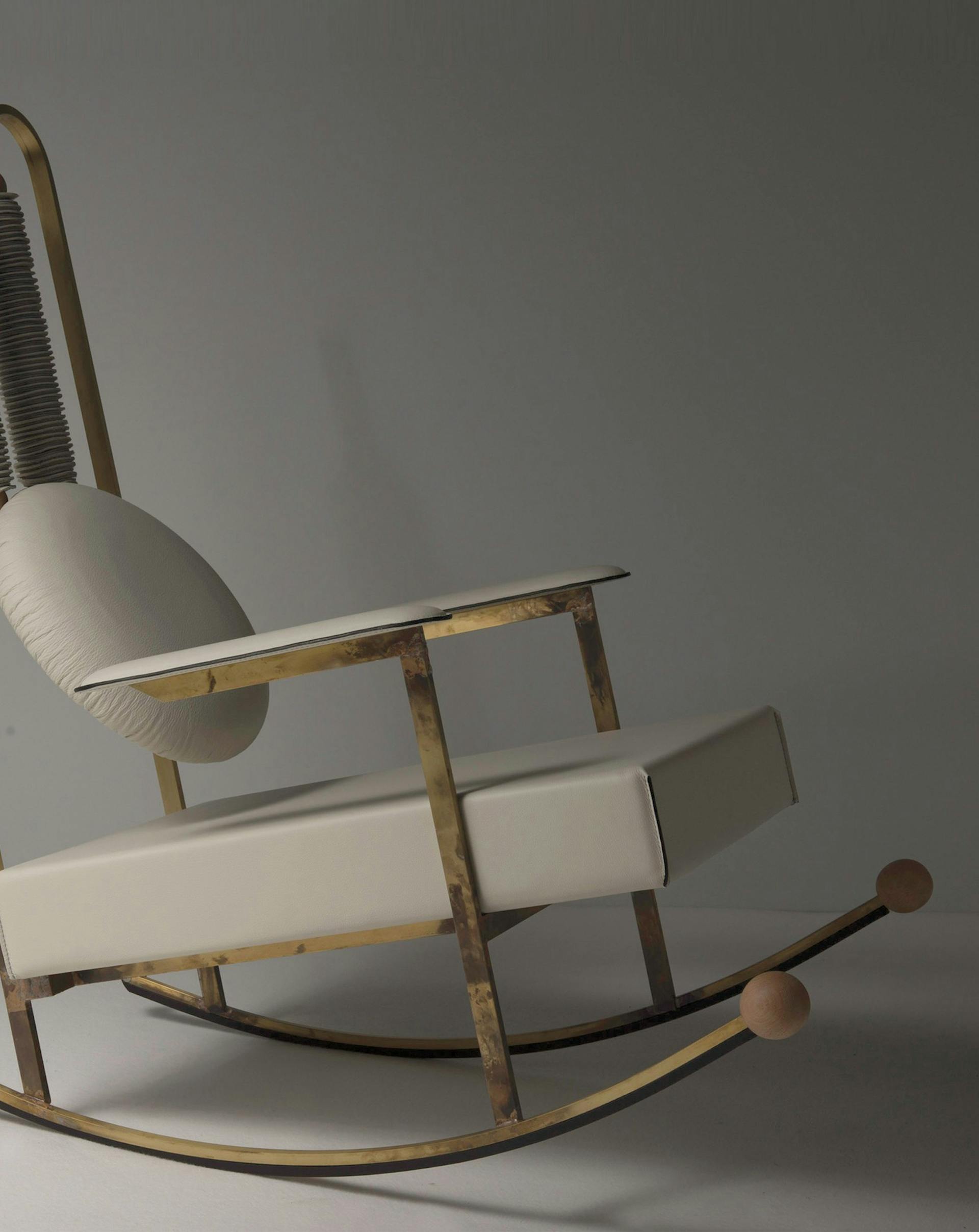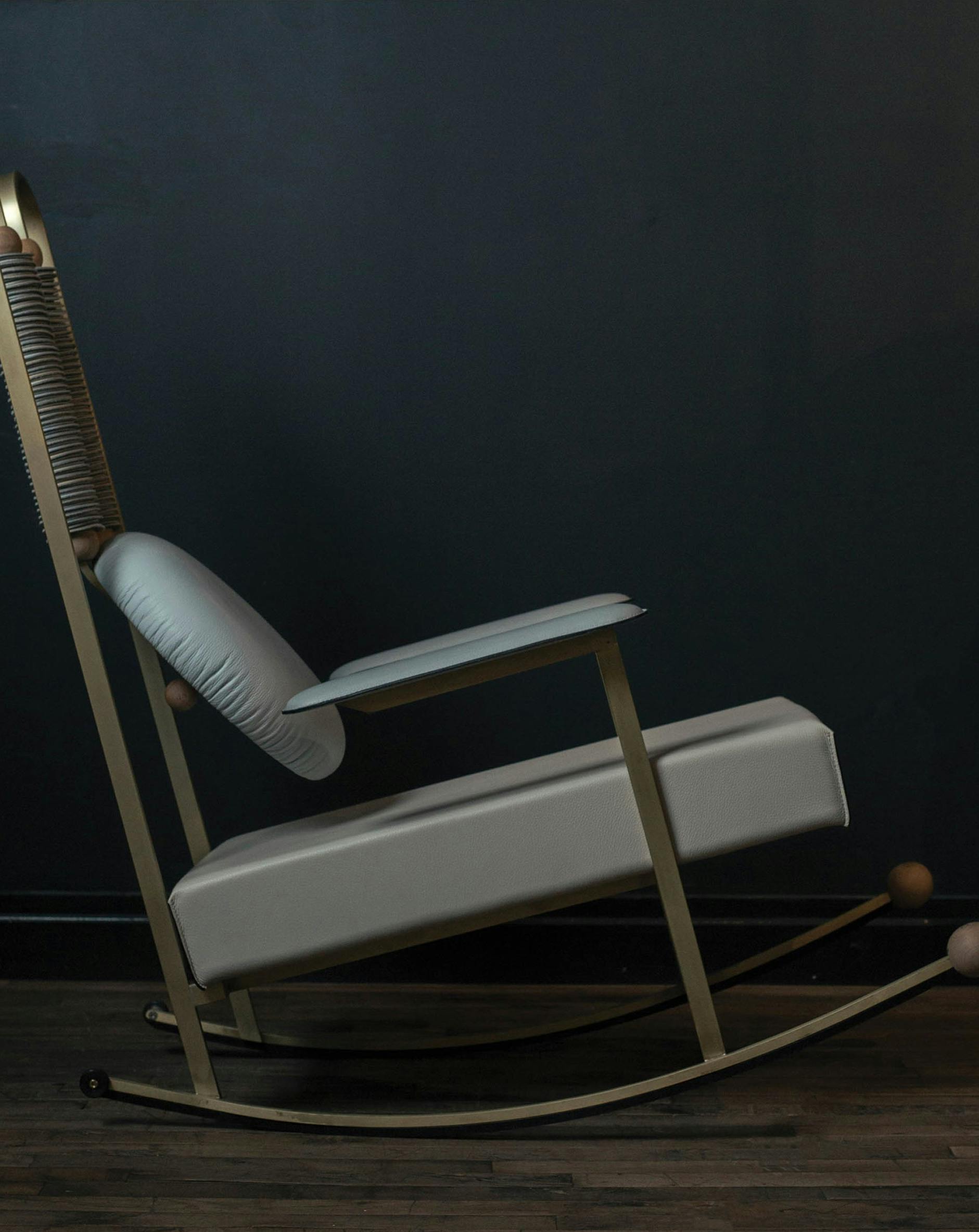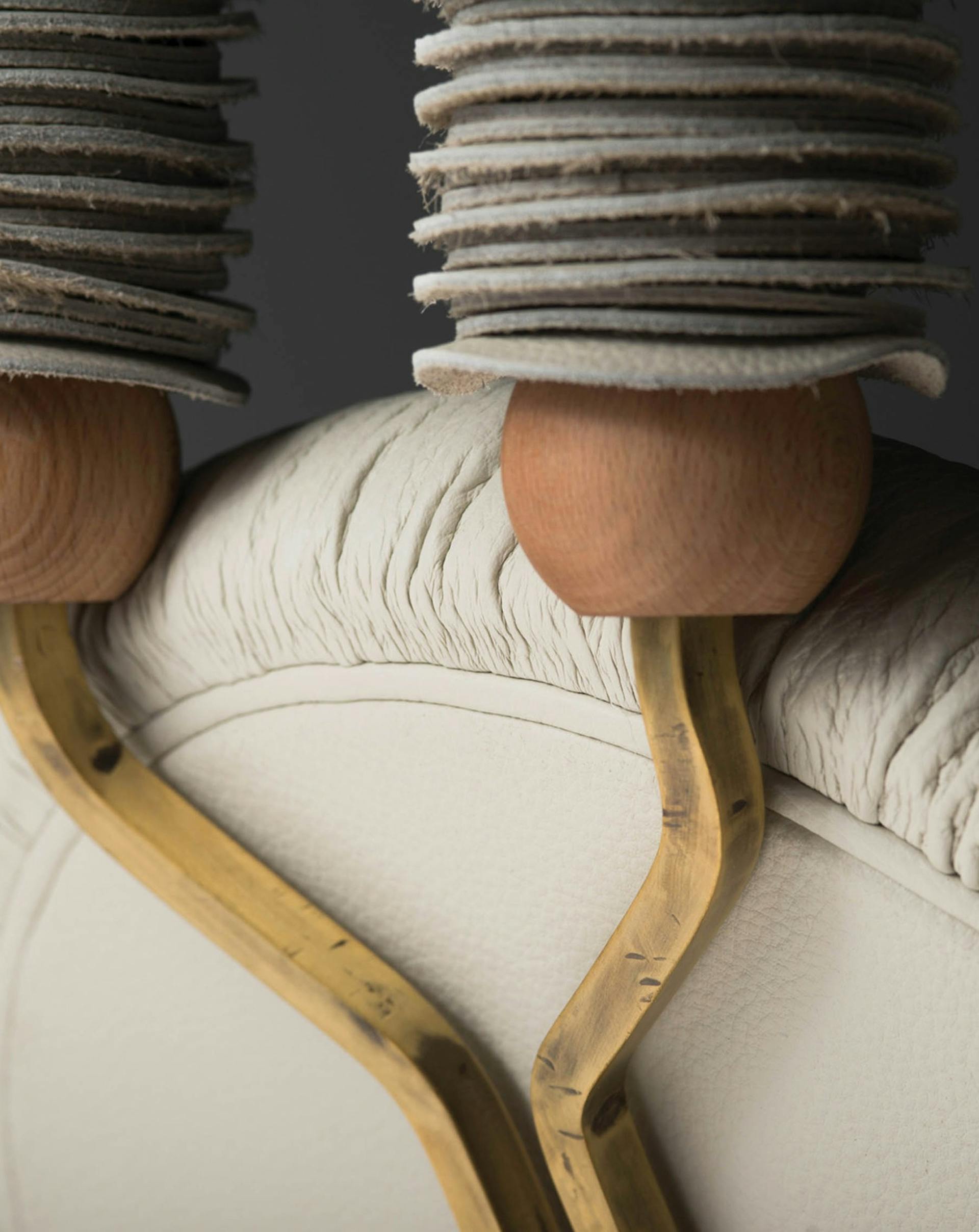 The rocking chair has a spring back structure on wich are mounted the two rolls that function as a headrest. The wooden spheres on the front of the rocking base can be used as footrests that allow the user to rock the chair without touching the ground. The headrest rolls are made of flat rings of leather, collected and repurposed from the leather scraps from the upholstery process.