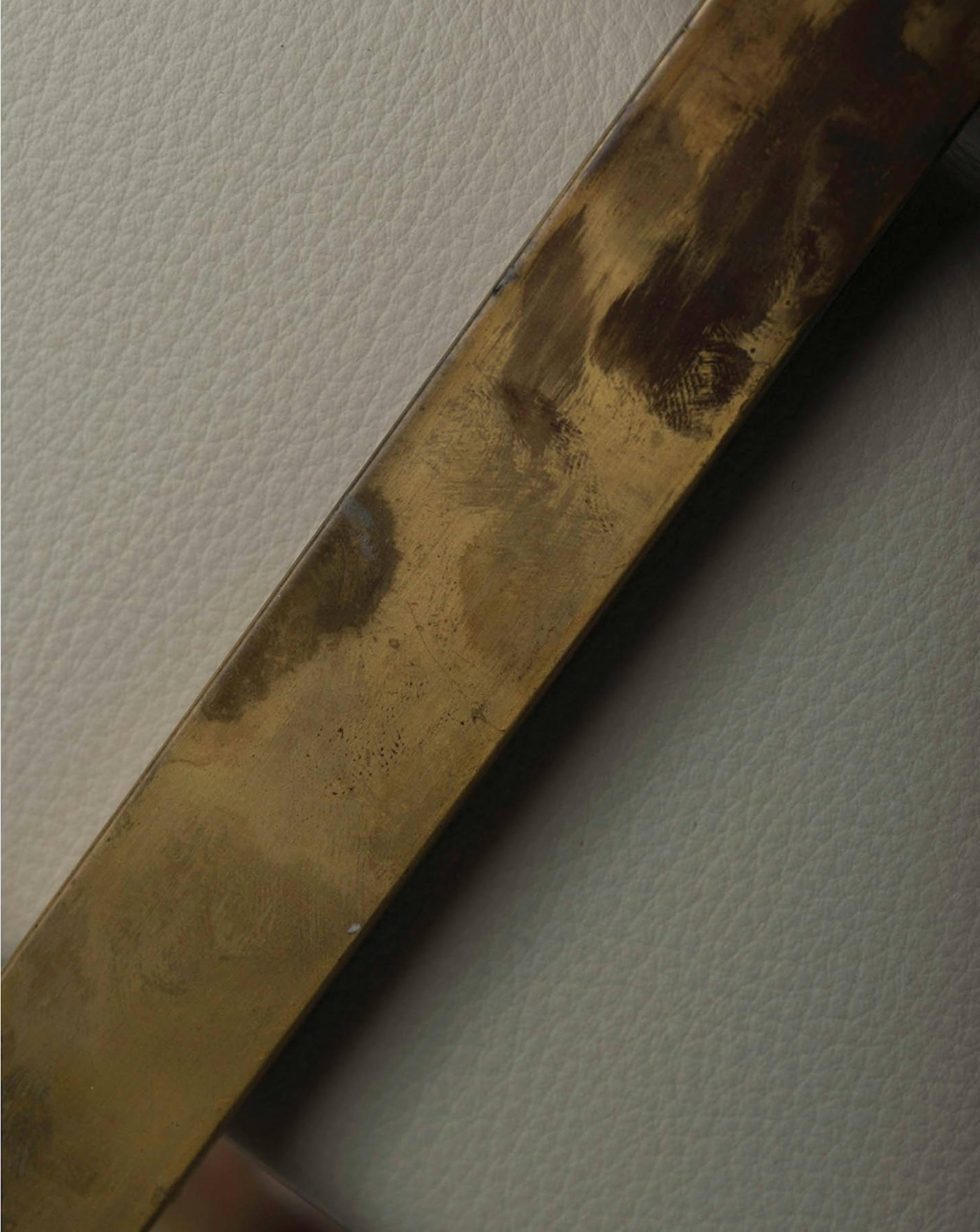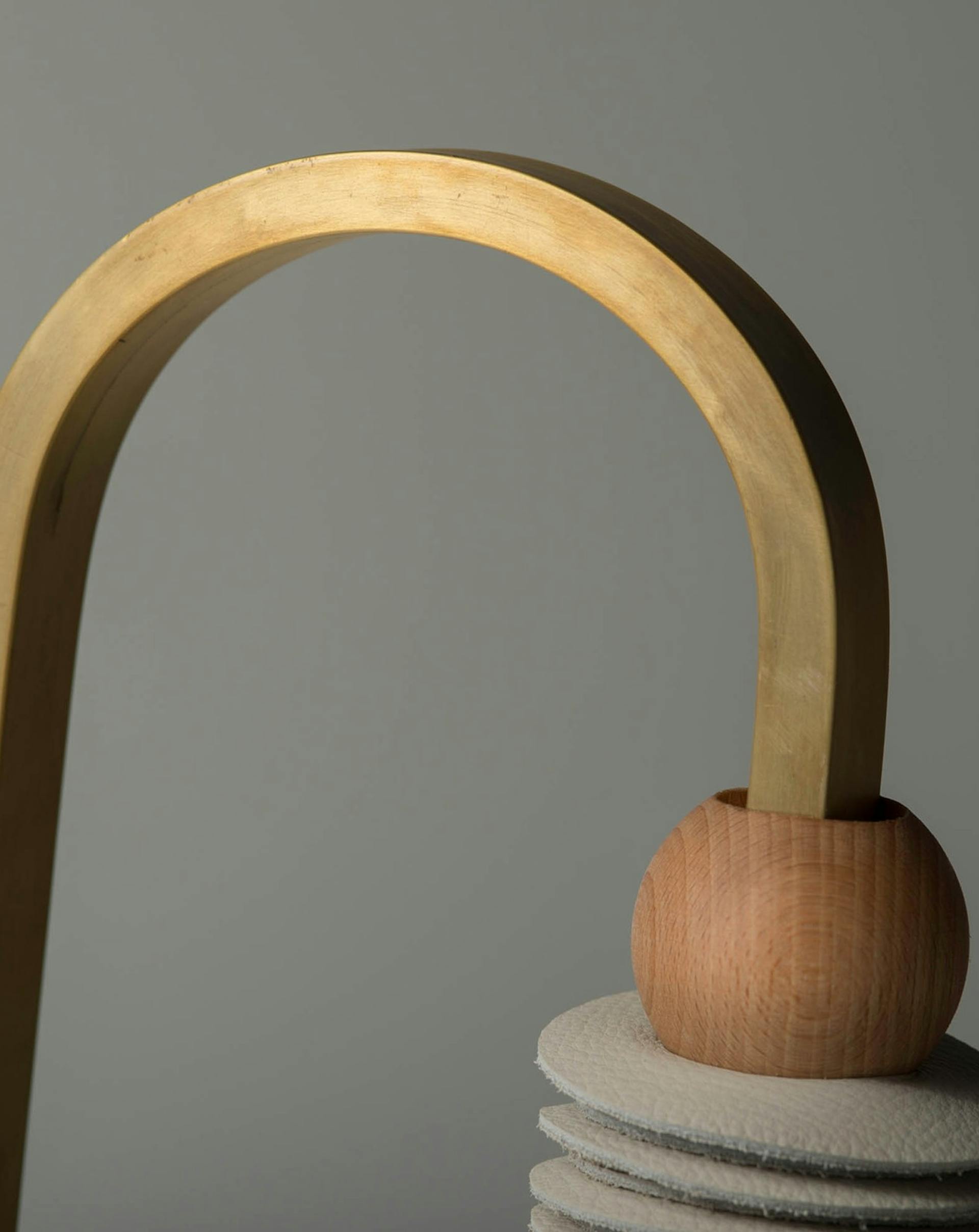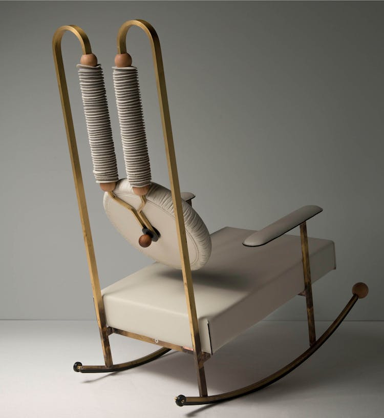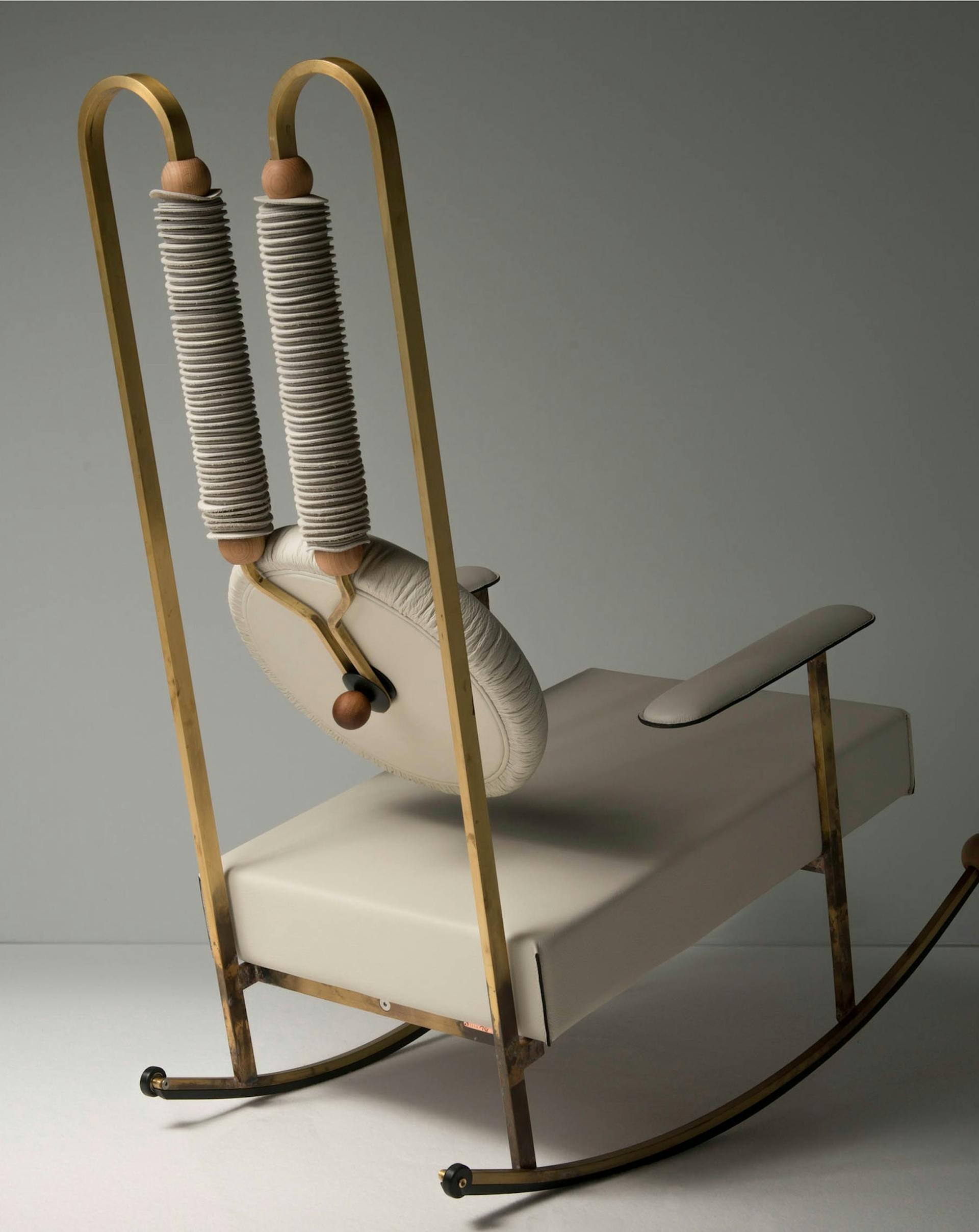 The rocking chair has a spring back structure on wich are mounted the two rolls that function as a headrest. The wooden spheres on the front of the rocking base can be used as footrests that allow the user to rock the chair without touching the ground. The headrest rolls are made of flat rings of leather, collected and repurposed from the leather scraps from the upholstery process.