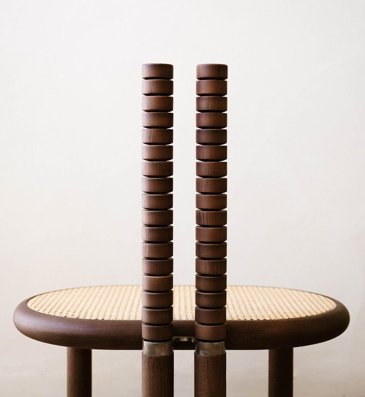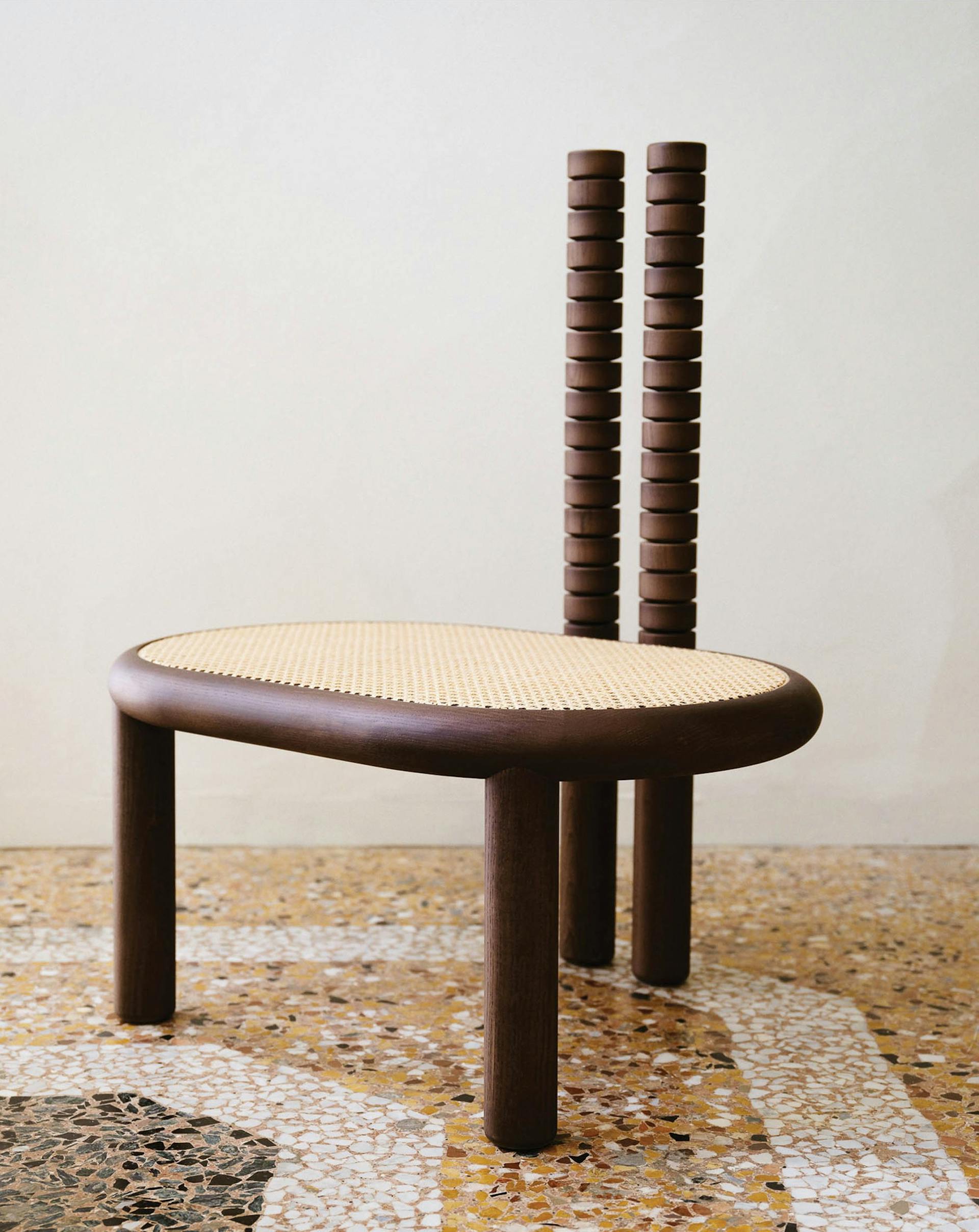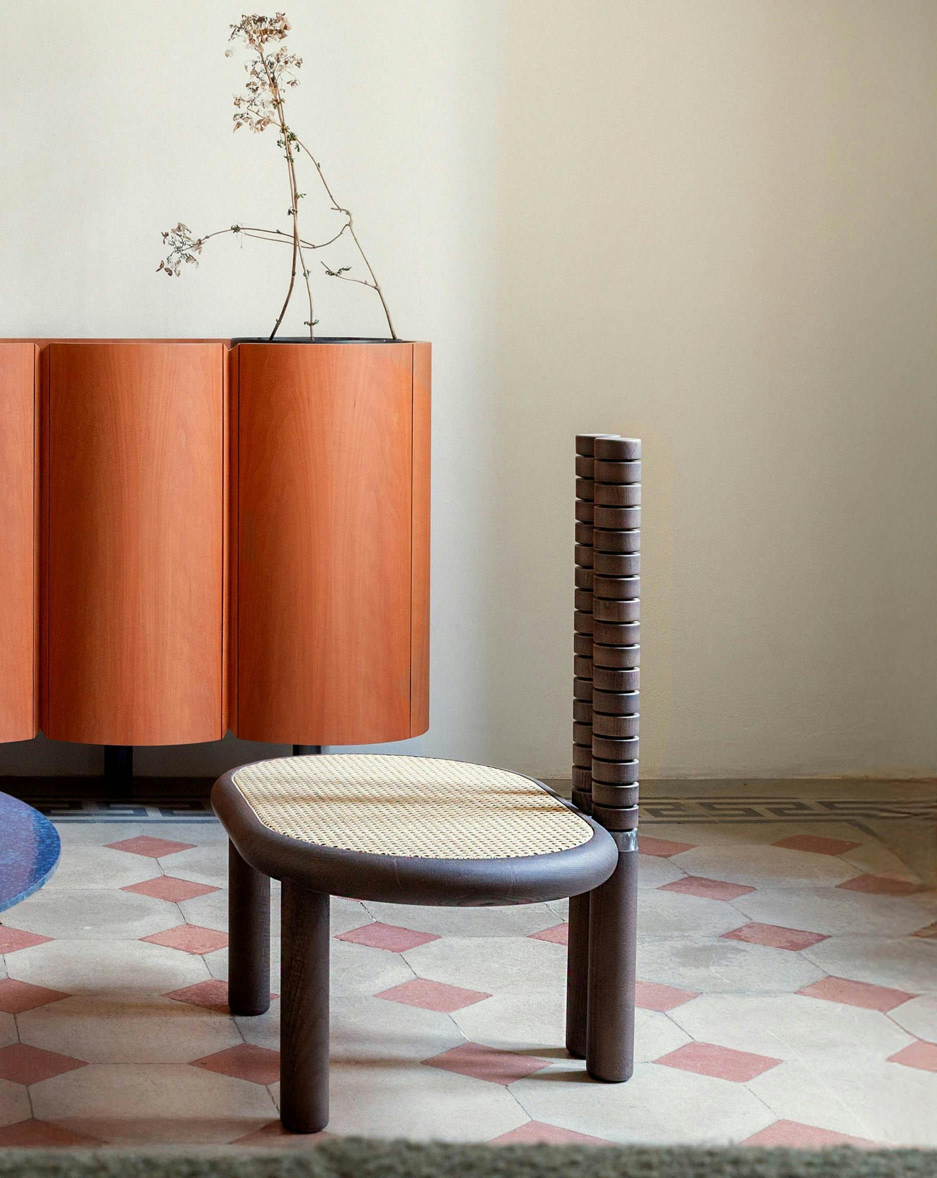 The Vertebra chair combines natural wood with flexible design. Its two backrests are malleable and move with your spine, providing adaptive support as you shift positions. The wide, low seat offers a grounded, comfortable feel, and is shown in both a rattan weave as well as upholstered. This chair responds to your movements, whether you're sitting upright or leaning back, offering a balance of flexibility and comfort.